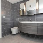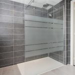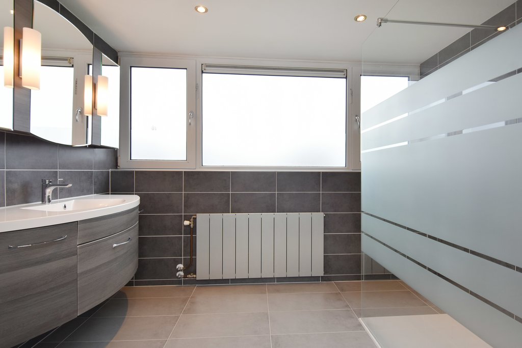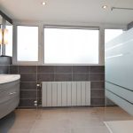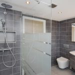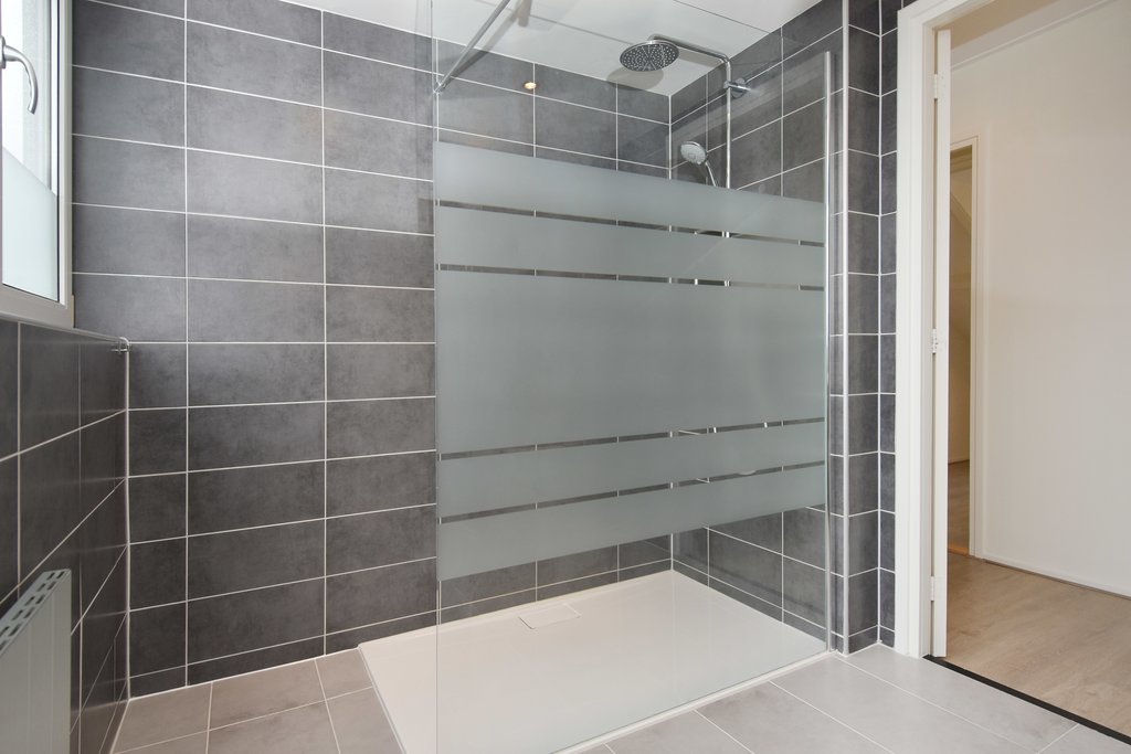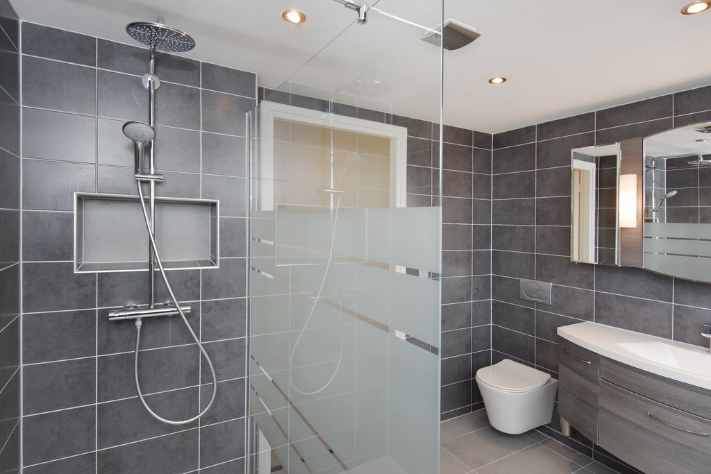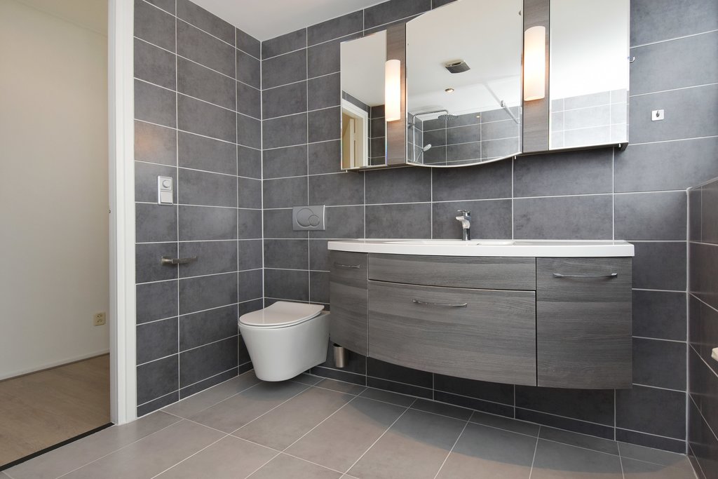 Luxe en moderne badkamer met dubbele wastafel, inloopdouche, toilet, strak tegelwerk en veel lichtinval.