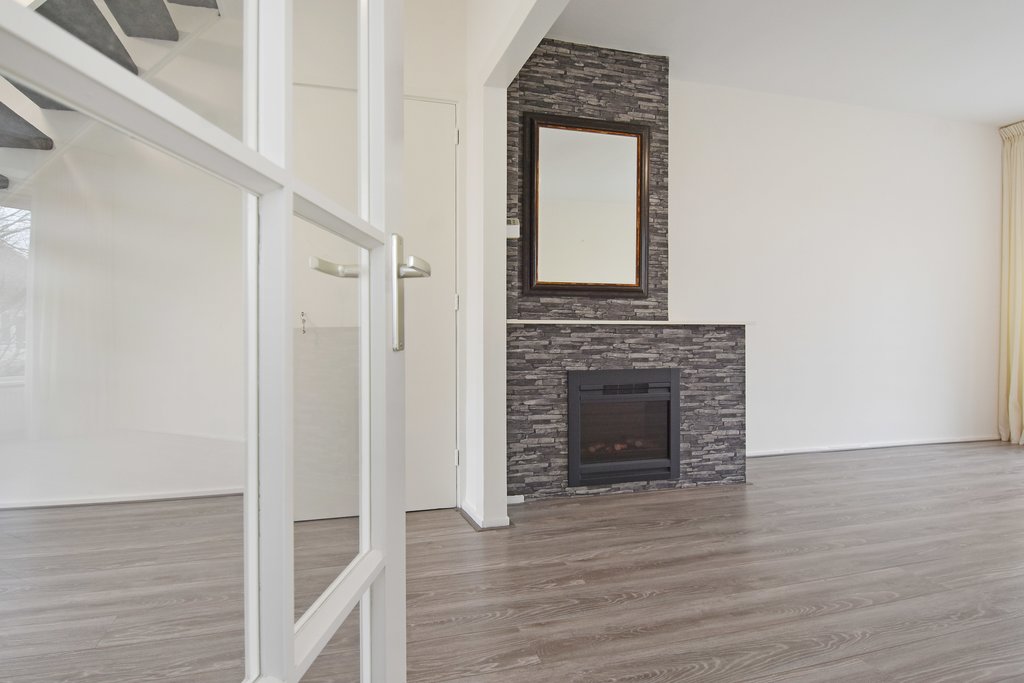 De lichte woonkamer met grote raampartijen aan beide kanten biedt een heerlijk uitzicht over het groen.