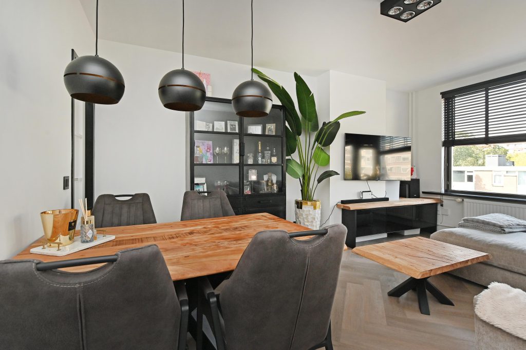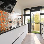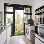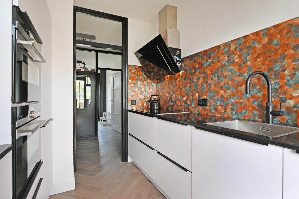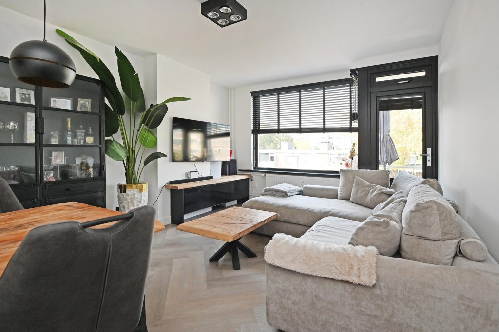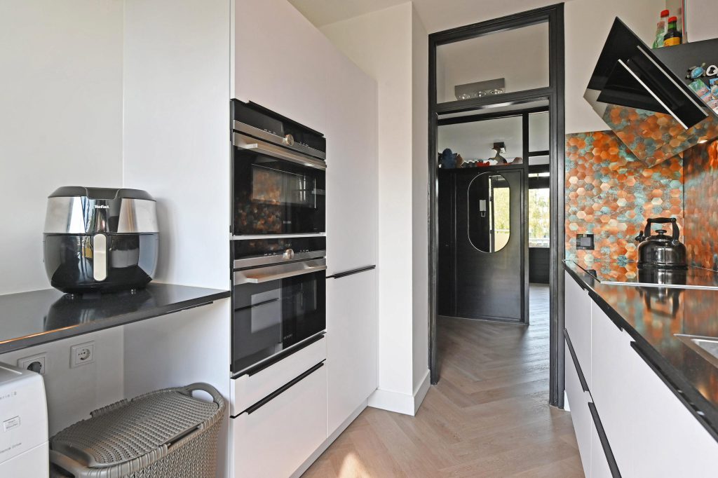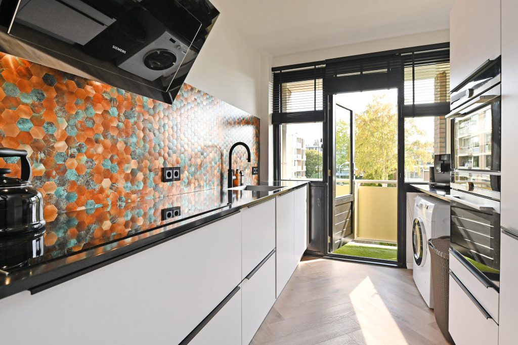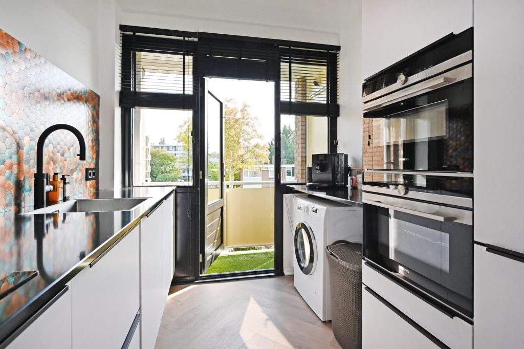 De woning beschikt over een lichte woonkamer met toegang tot het balkon aan de voorzijde – een heerlijke plek om van de middagzon te genieten. Aan de achterzijde bevindt zich het tweede balkon met ochtendzon, bereikbaar via de moderne keuken. De keuken is praktisch ingericht en voorzien van diverse inbouwapparatuur, waardoor koken hier een plezier is.