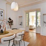 Royale en sfeervolle woon-/eetkamer en suite met fraaie geornamenteerde plafonds en originele schuifseparatie met glas-in-lood en vaste kasten. Vanuit de achterkamer openslaande deuren naar de ruim 13 meter diepe achtertuin.