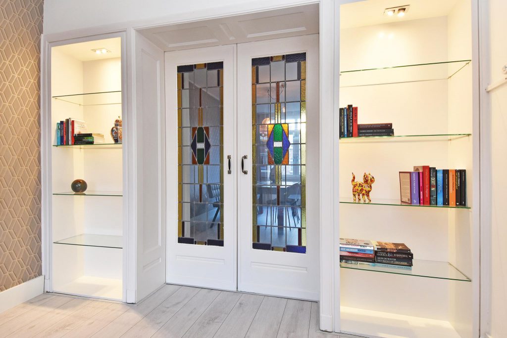 The apartment was largely renovated in 2021 and in addition to a new bathroom and kitchen. It has new wooden frames with double glazing in which the original stained glass windows have been replaced some years ago. In addition to the stained glass, the apartment is still equipped with various original details, including sliding doors, built in cupboards and panel doors.