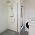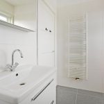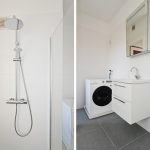 De aan de voorzijde gelegen moderne badkamer is voorzien van wastafelmeubel, inloopdouche en aansluitingen voor de wasmachine. De badkamer biedt tevens toegang tot het voorbalkonnetje.