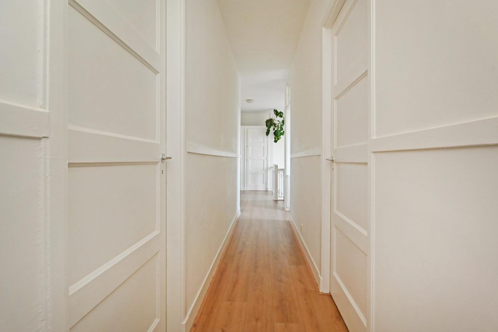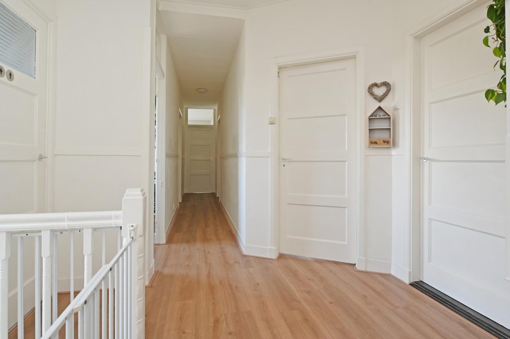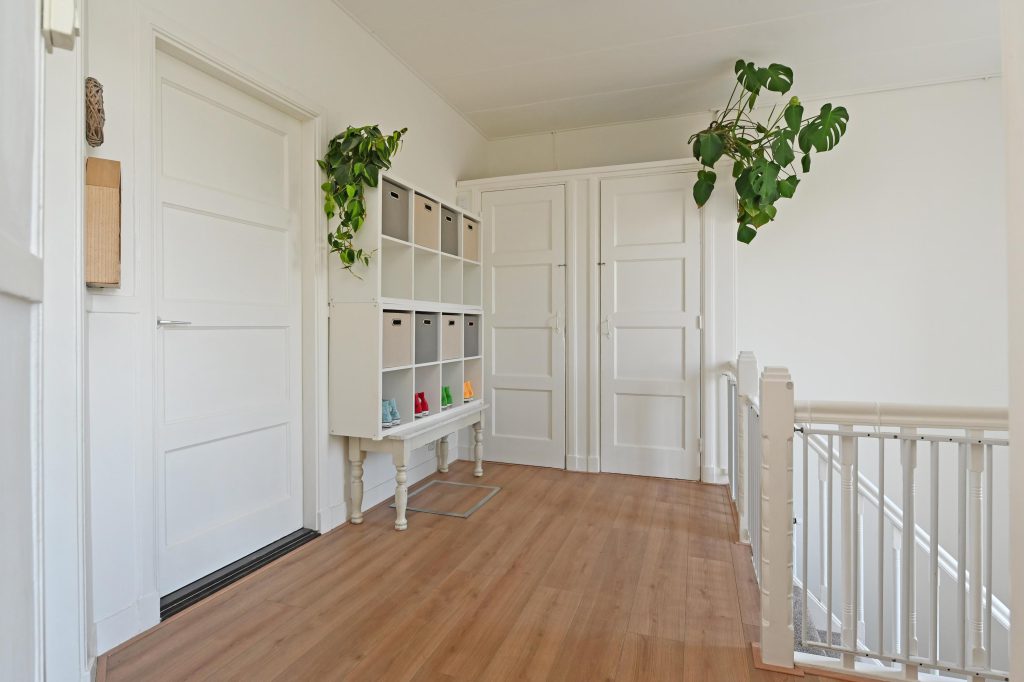 Binnentrap naar de tweede etage met royale overloop voorzien van vaste kast en een moderne wc.