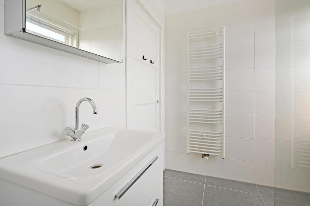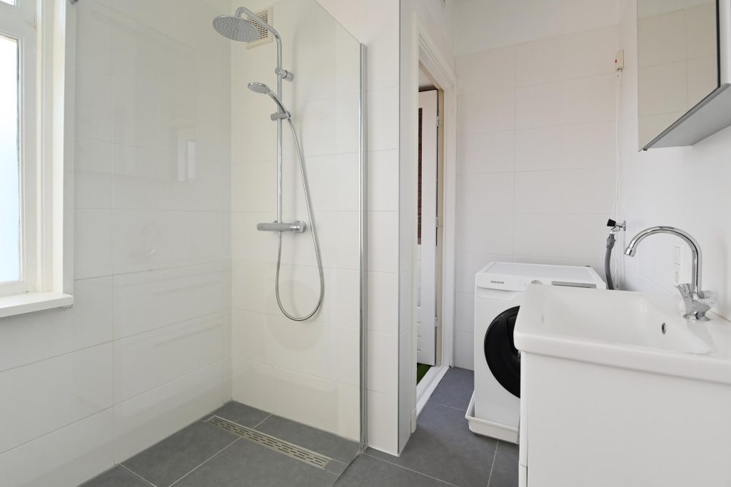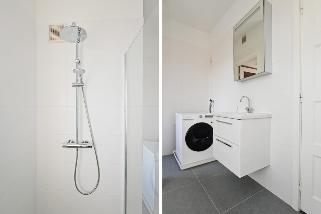 De aan de voorzijde gelegen moderne badkamer is voorzien van wastafelmeubel, inloopdouche en aansluitingen voor de wasmachine. De badkamer biedt tevens toegang tot het voorbalkonnetje.