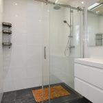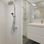 De moderne tussengelegen badkamer is voorzien van inloopdouche en een wastafelmeubel.