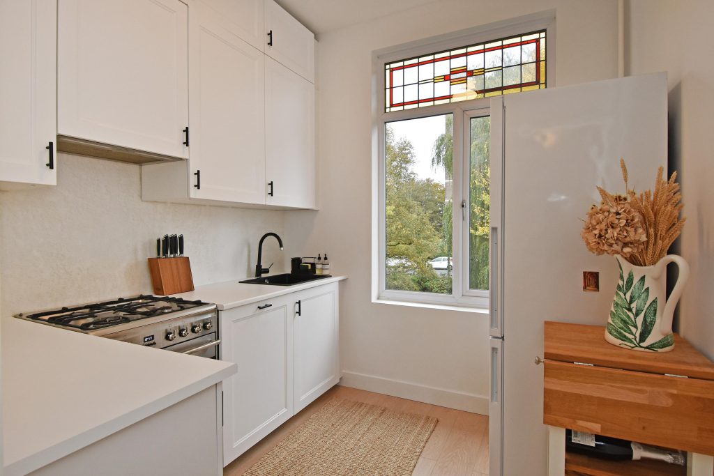 Binnen treft u prachtige glas-in-lood schuifseparaties, fraaie houten vloeren en hoge plafonds die samen zorgen voor een lichte en aangename woonbeleving. De woonkamer en suite biedt ruimte en charme, terwijl de goed ingedeelde keuken en de drie volwaardige slaapkamers zorgen voor optimaal wooncomfort.
