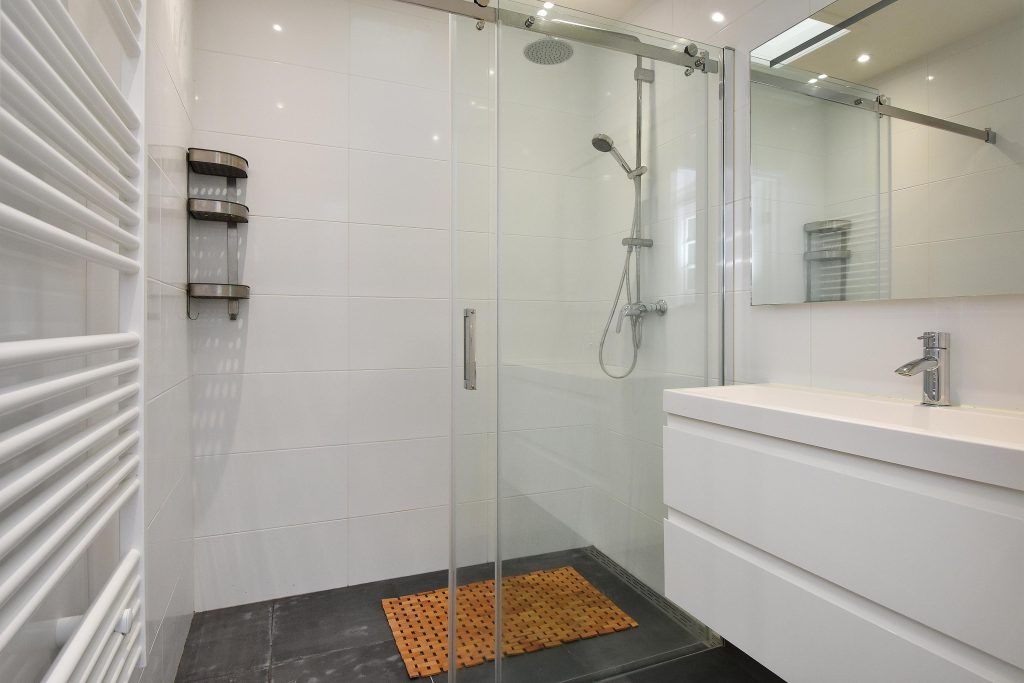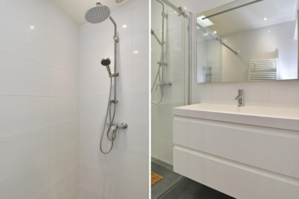 De moderne tussengelegen badkamer is voorzien van inloopdouche en een wastafelmeubel.
