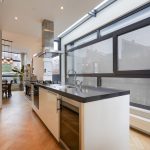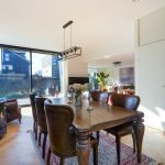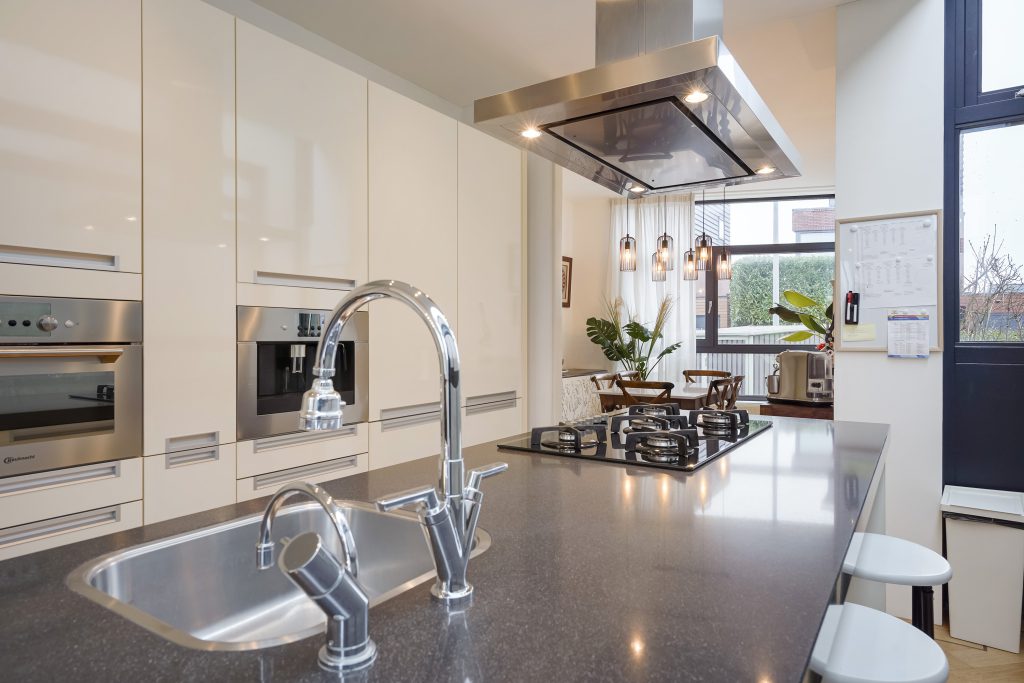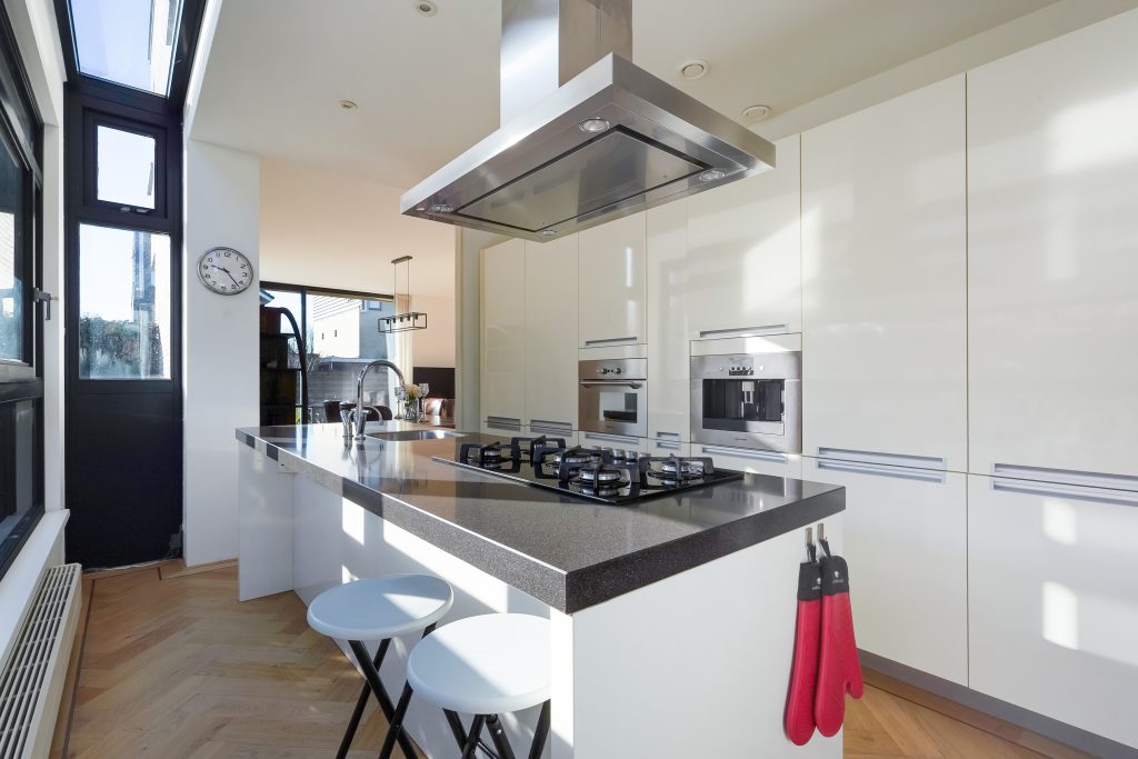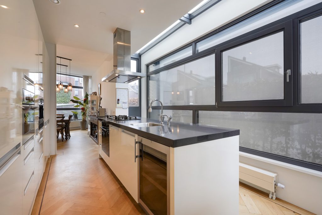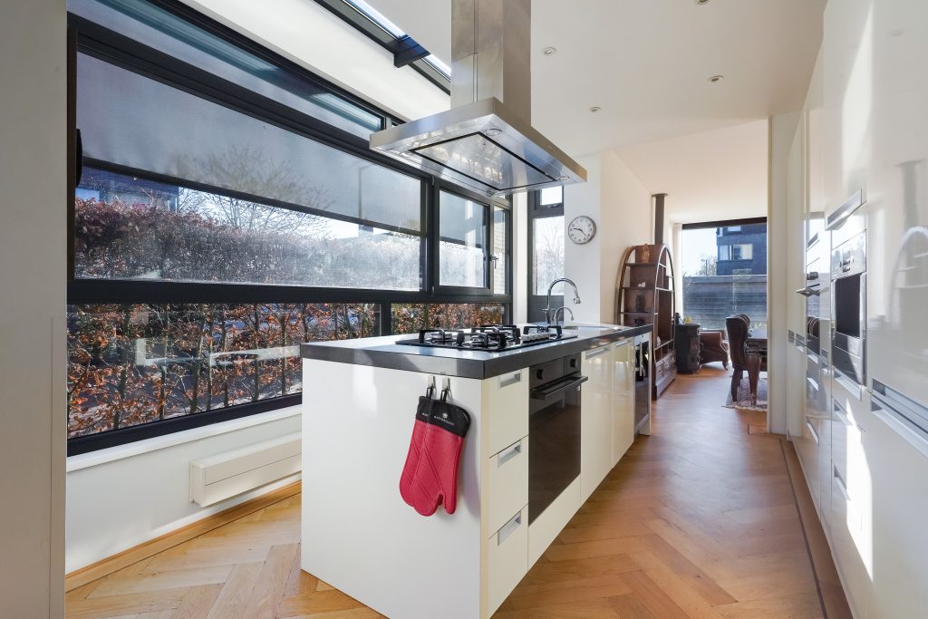 De keuken vormt het stijlvolle middelpunt van het huis. Het kookeiland biedt niet alleen werkruimte, maar ook een gezellige plek om samen te komen. Dankzij de brede glaspartijen geniet je hier van een prachtige lichtinval.