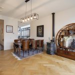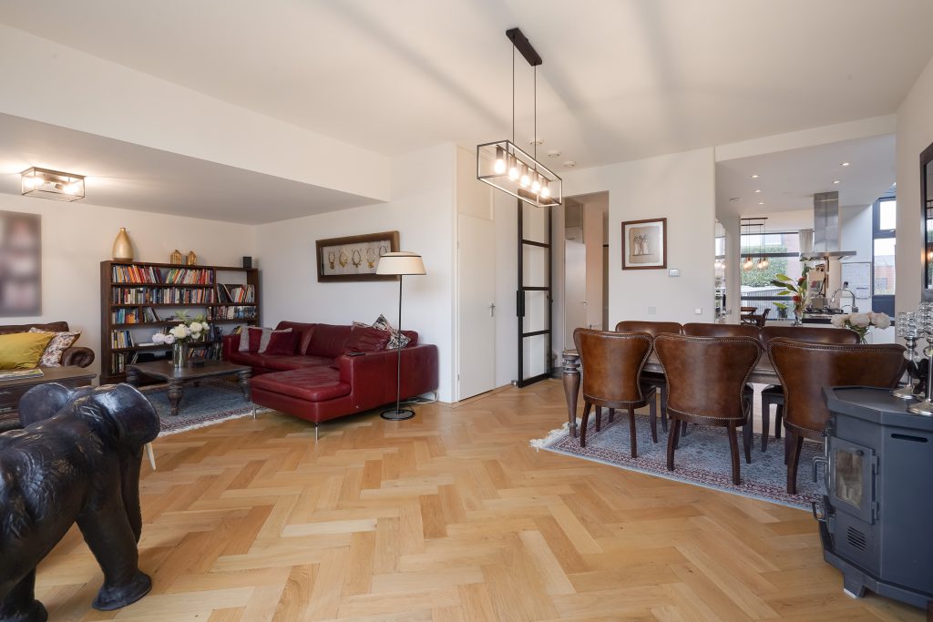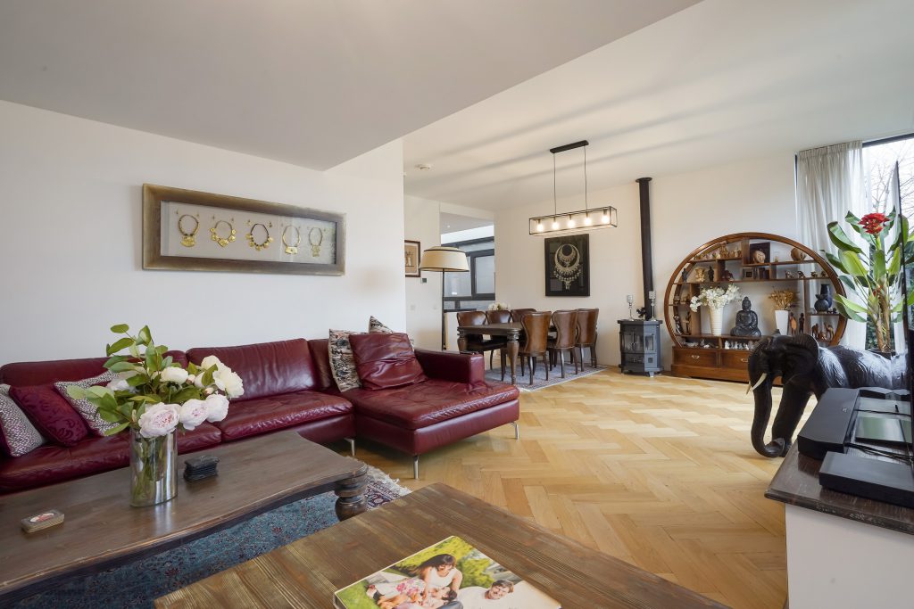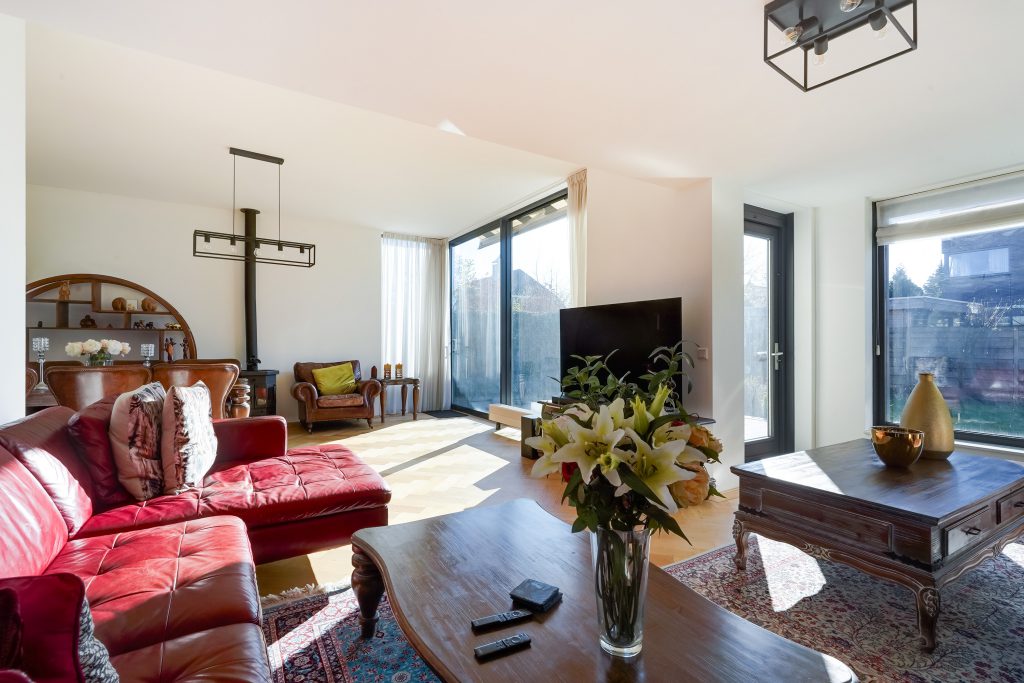 – Riante woonkamer met houtkachel, grote raampartijen en schuifpui naar de zonnige tuin.