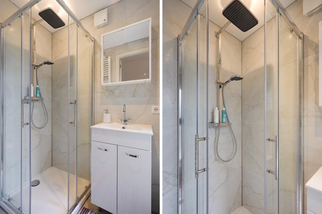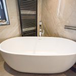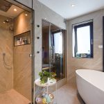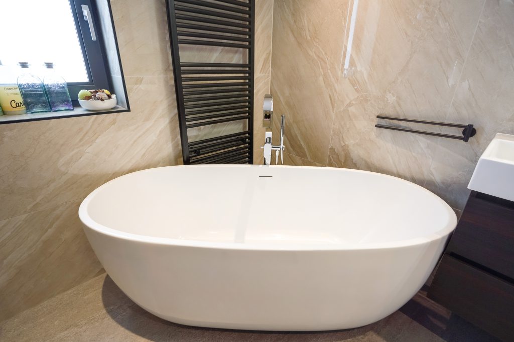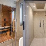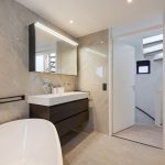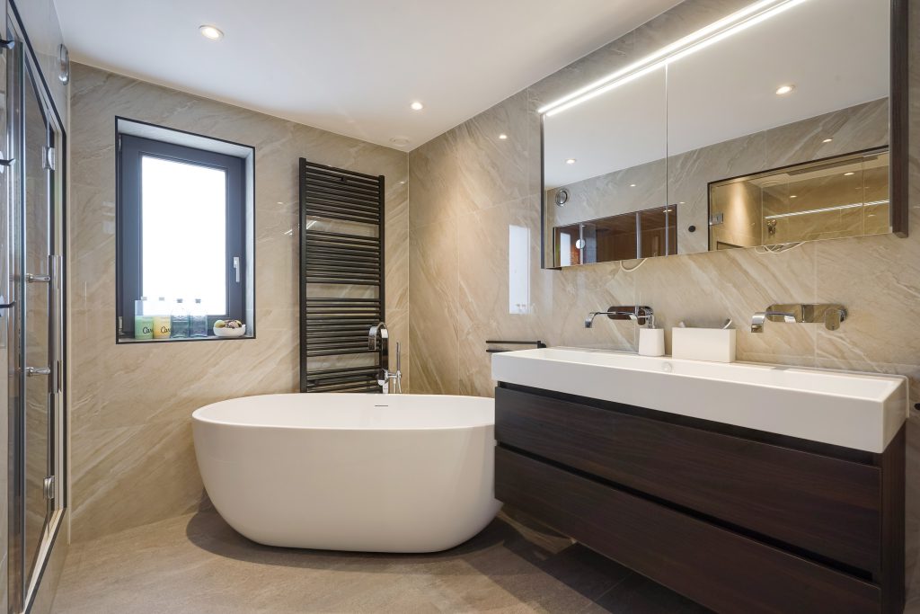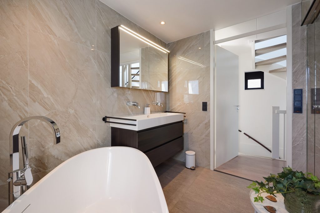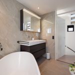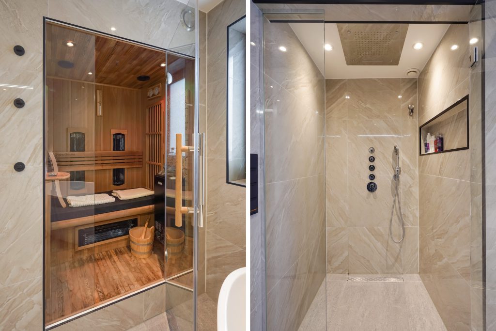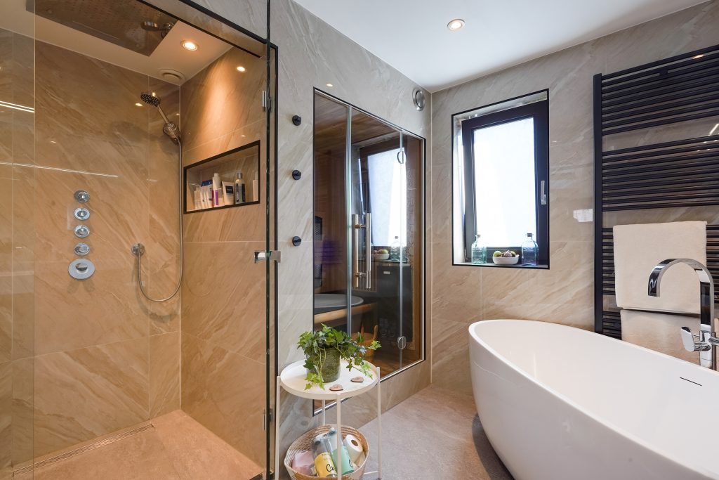– Luxe badkamer met ligbad, dubbele wastafel, sauna en inloopdouche