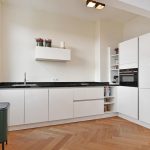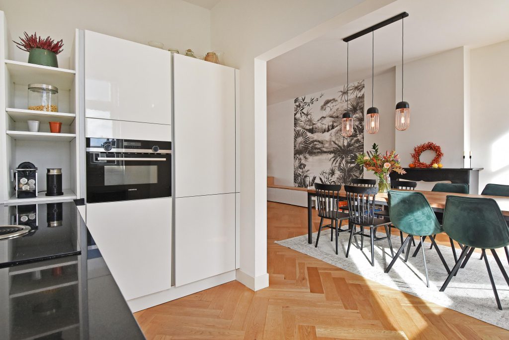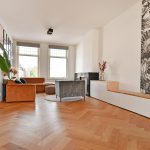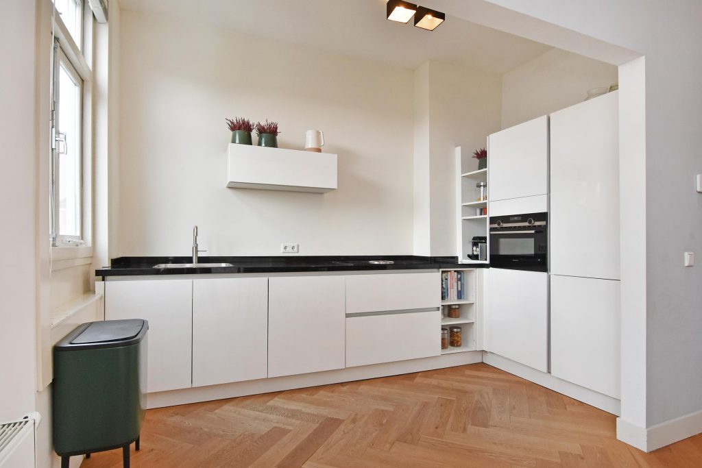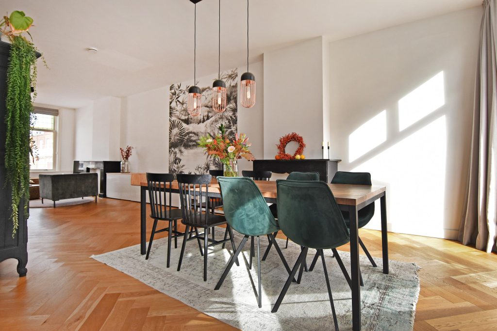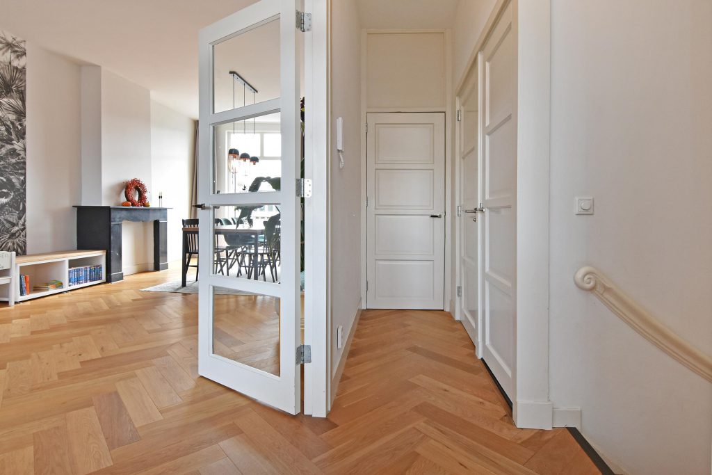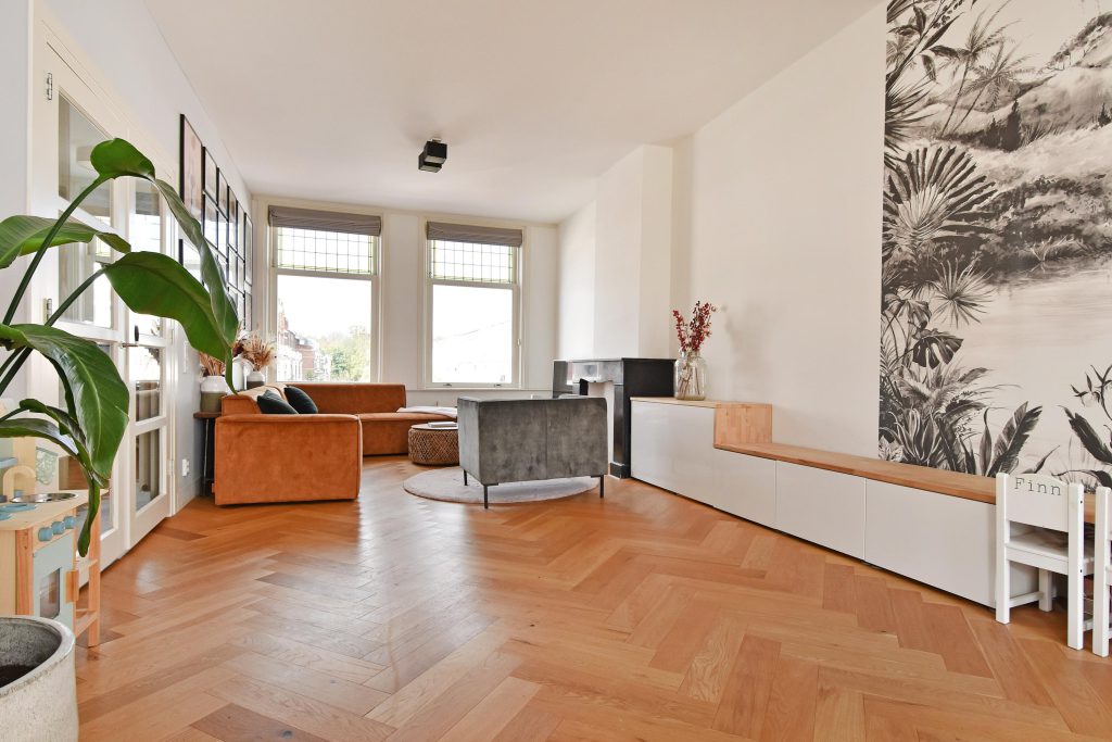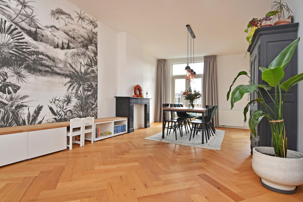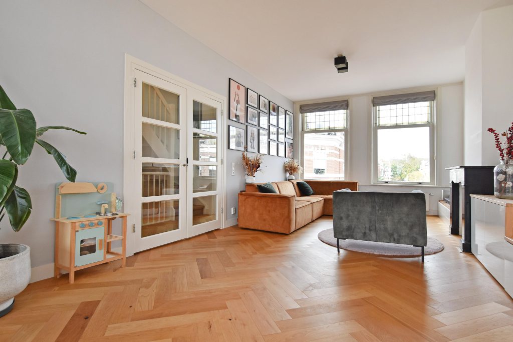 De tweede verdieping vormt het hart van het huis. Zodra je binnenkomt, voel je de ruimte en warmte van de royale woon- en eetkamer. De grote ramen, het glas-in-lood, de marmeren schouwen en de houten visgraatvloer zorgen samen voor een unieke, stijlvolle sfeer waarin oud en nieuw elkaar moeiteloos aanvullen. Daarnaast biedt het appartement vanuit de woonkamer een prachtig vrij uitzicht over de Gerard Reijnststraat en het Haagse Bos.