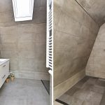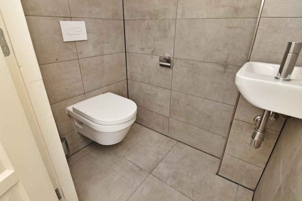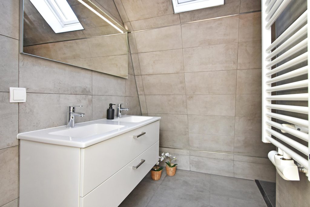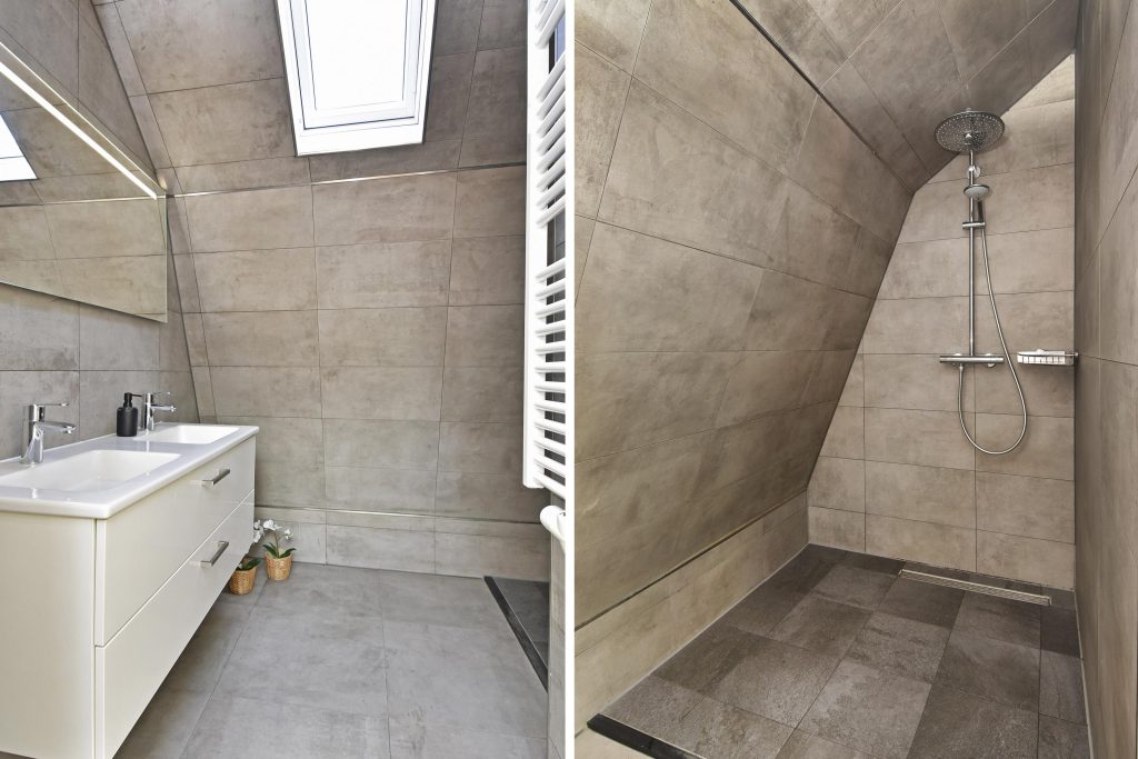 De badkamer is modern en comfortabel, met een inloopdouche en een strak wastafelmeubel. Daarnaast is er op deze verdieping een apart wc.