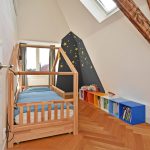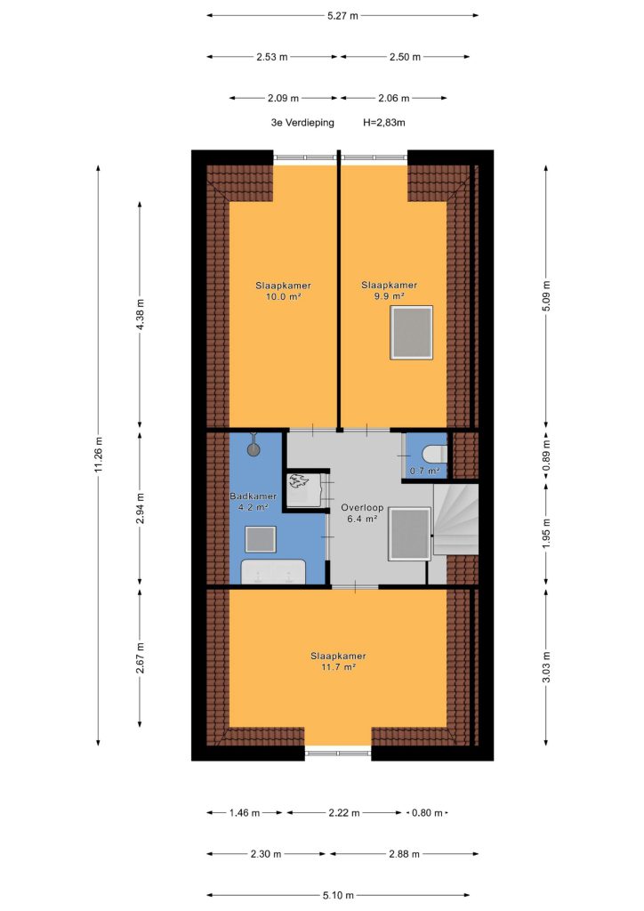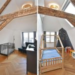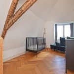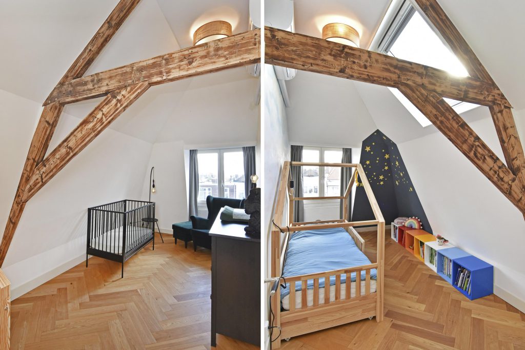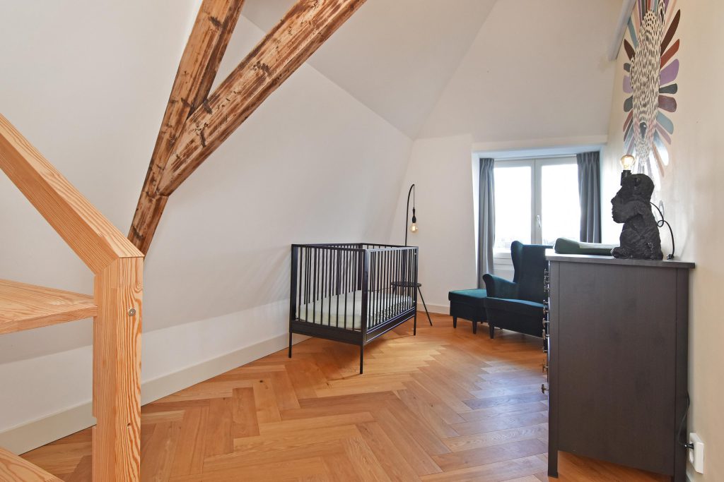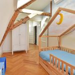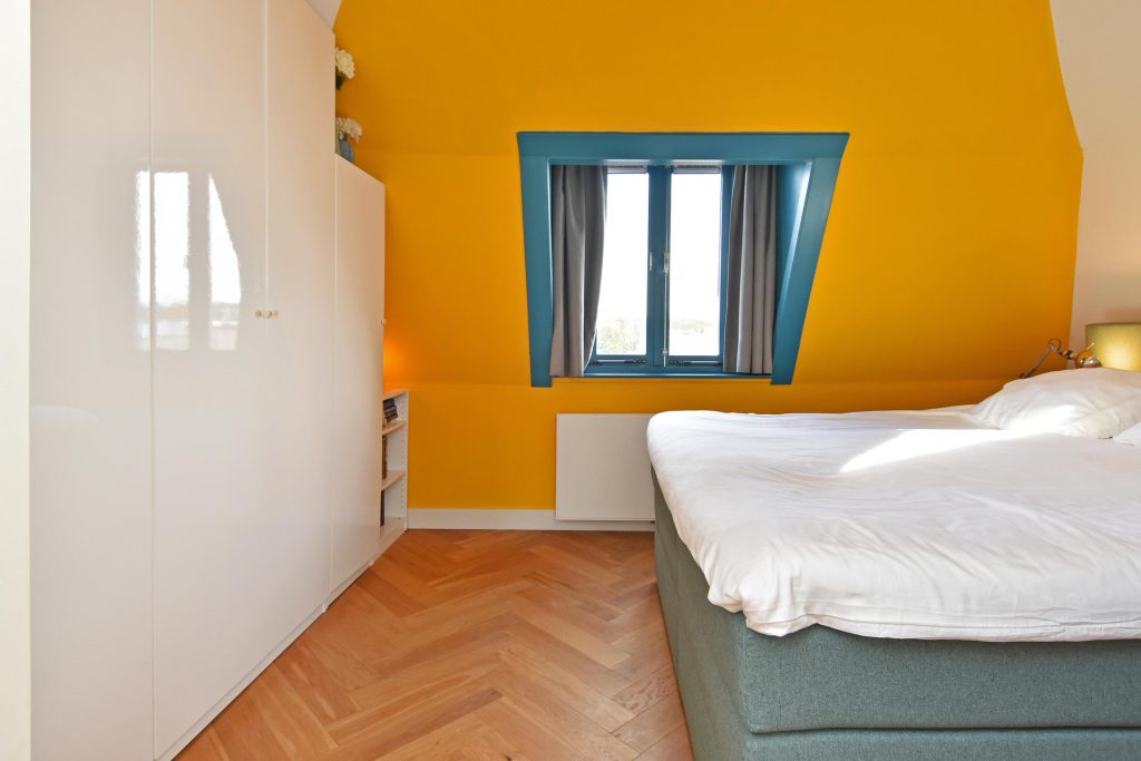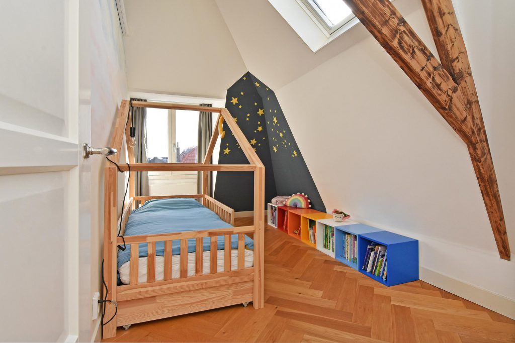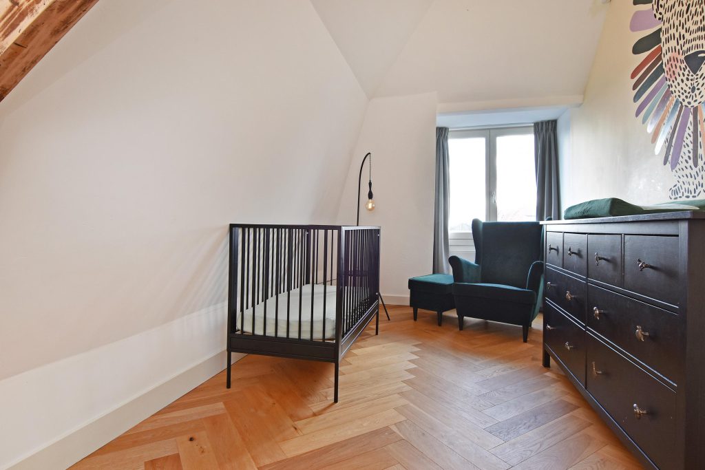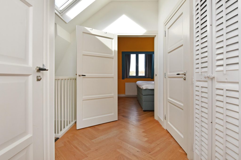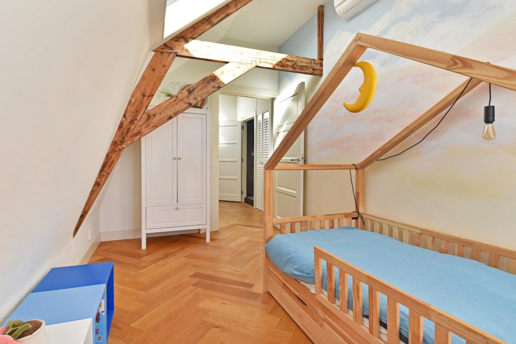 Op de derde, sfeervolle kapverdieping vind je drie slaapkamers, elk met hun eigen charme. De master bedroom heeft een vaste kastenwand en biedt volop bergruimte. De houten visgraatvloeren lopen ook hier mooi door en de zichtbare balken en schuine wanden geven de verdieping karakter en warmte.