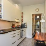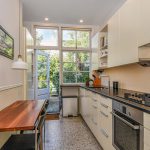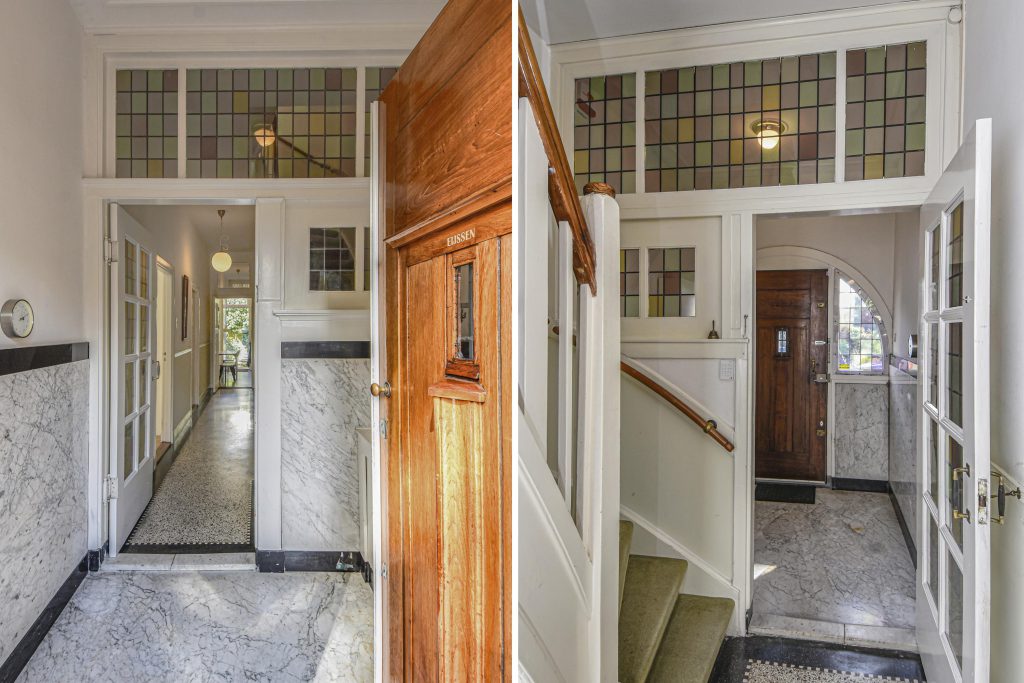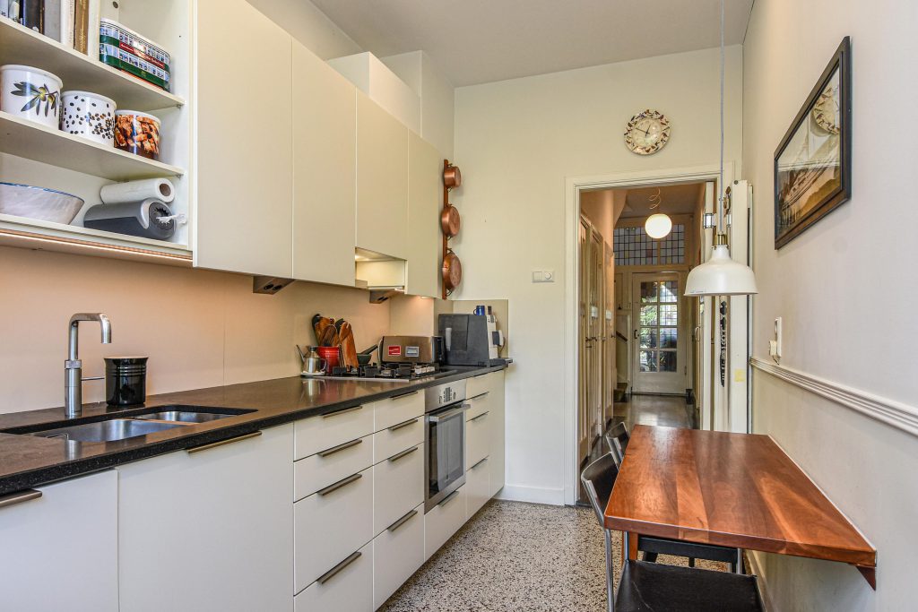 Entree met fraaie marmeren hal v.v. lambrisering, glas in lood tochtdeur naar de hal v.v. prachtige granitovloer, bergruimte onder de trap, wc en toegang tot de ruime kelder met opstelplaats van CV-ketel. Royale woonkamer en suite met fraaie visgraatparketvloeren, marmeren schouwen en originele glas in lood schuifseparatie met diverse vaste kasten. De woonkamer is aan de voorzijde voorzien van een erker en biedt aan de achterzijde toegang tot de fraai aangelegde, bloemenrijke achtertuin met late ochtend, middag en avondzon. De moderne keuken is voorzien van een extra diep natuurstenen aanrecht, een quooker en diverse inbouwapparatuur waaronder een gaskookplaat, oven, afwasmachine en koel-, vriescombinatie. De keuken biedt tevens toegang tot de achtertuin.