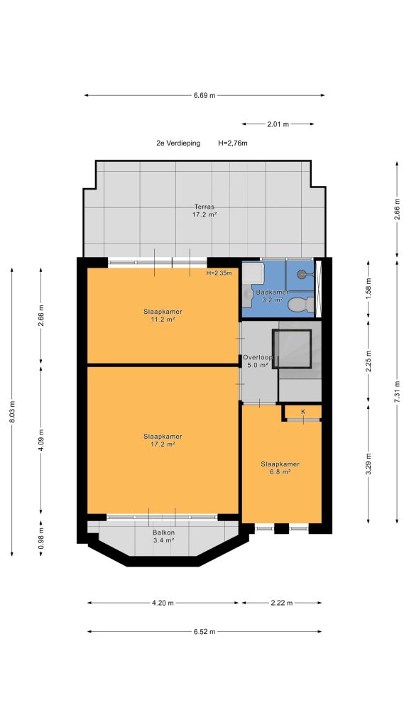 Overloop met badkamer voorzien van douche, vaste wastafel, wc en opstelplaats voor was- en droogmachine. Royale voorslaapkamer met schouw en ingebouwde boekenkast over volledige lengte en toegang tot het voorbalkon. Voorzijkabinet met vaste kast. Achterslaapkamer met toegang tot het riante dakterras met middag en avondzon.