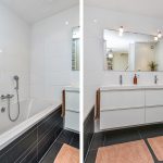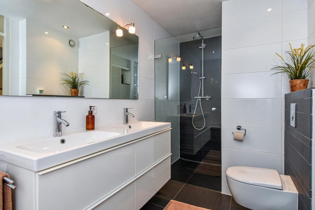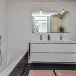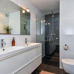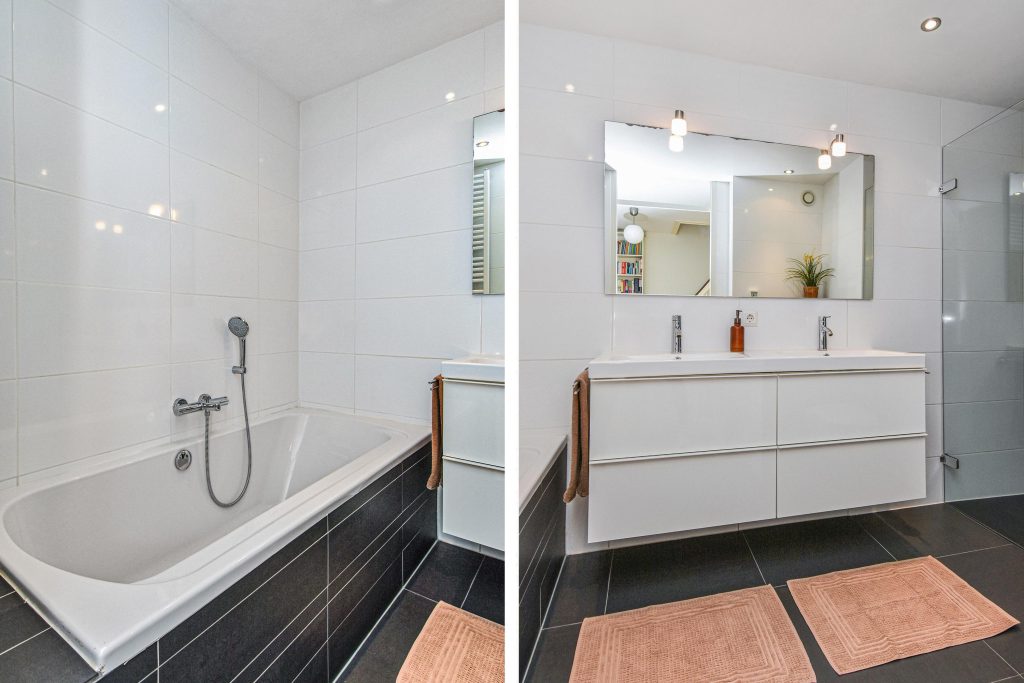 De eerste verdieping beschikt over drie volwaardige slaapkamers, waaronder een royale master bedroom. De stijlvolle badkamer met ligbad, dubbele wastafel en toilet is strak vormgegeven in lichte kleuren.