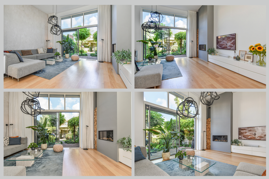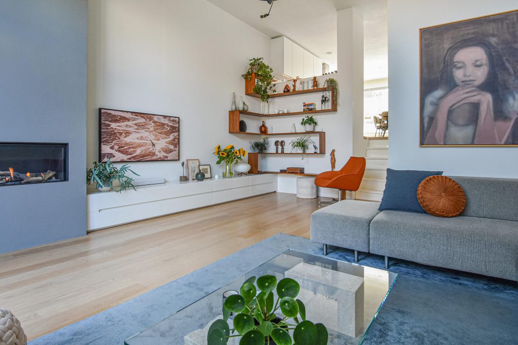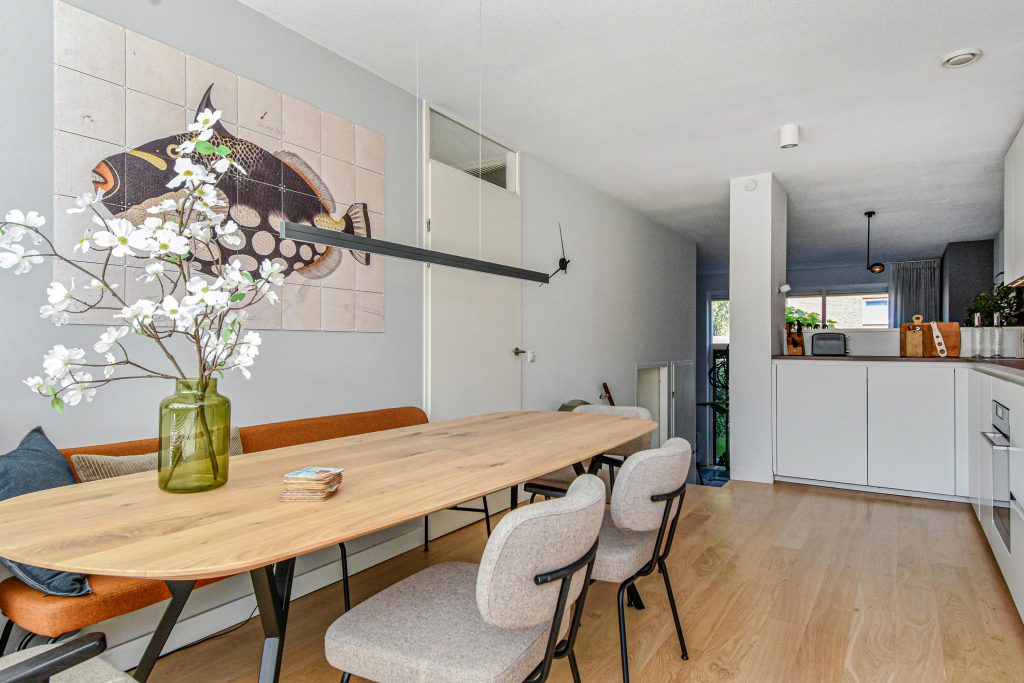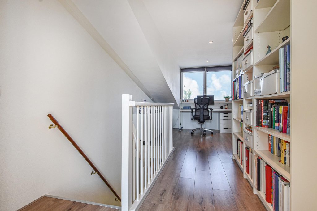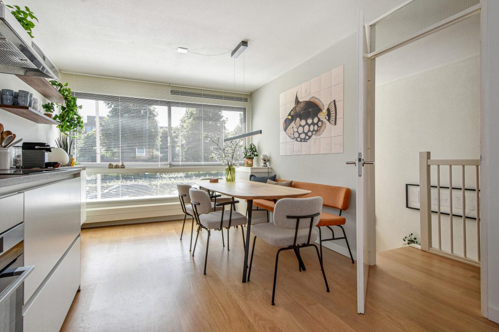De sfeervolle splitlevel-indeling zorgt voor een speelse indeling en een prachtige lichtinval door de hele woning. De hoge ramen, open zichtlijnen en de subtiele verbinding tussen de verschillende woonniveaus geven een gevoel van vrijheid.