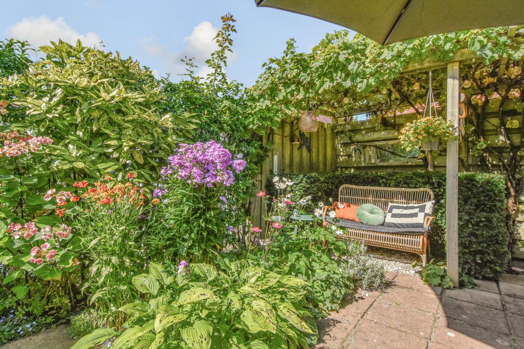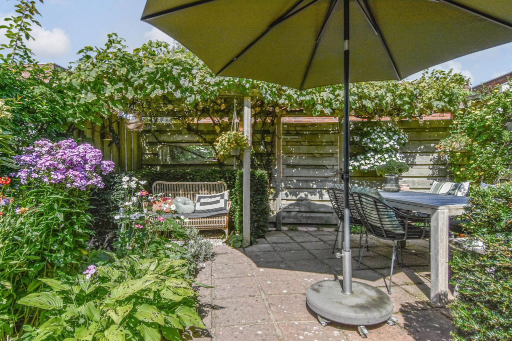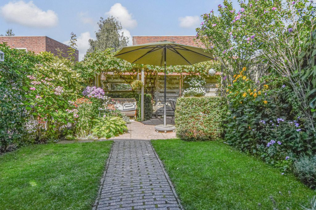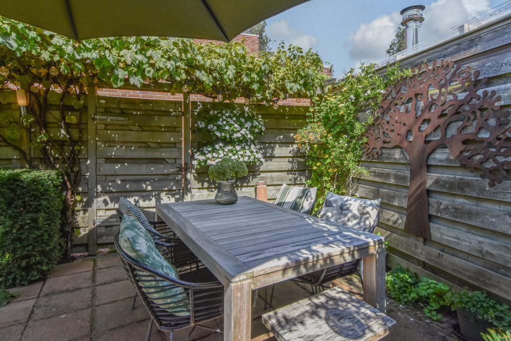 * Fraai aangelegde zonnige achtertuin met privacy en achterom
