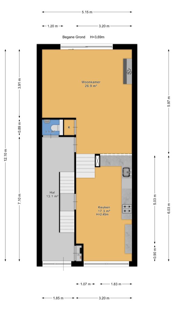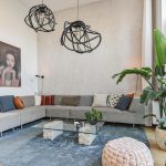 Een paar treden lager ligt de royale woonkamer met een indrukwekkende plafondhoogte van bijna 3,7 meter.