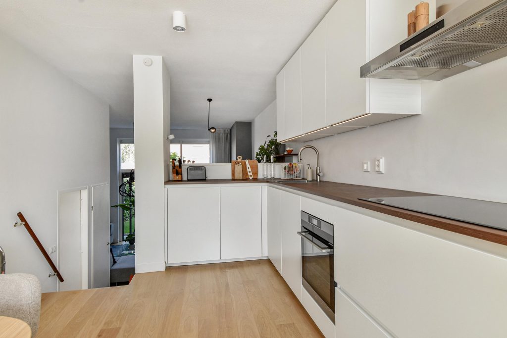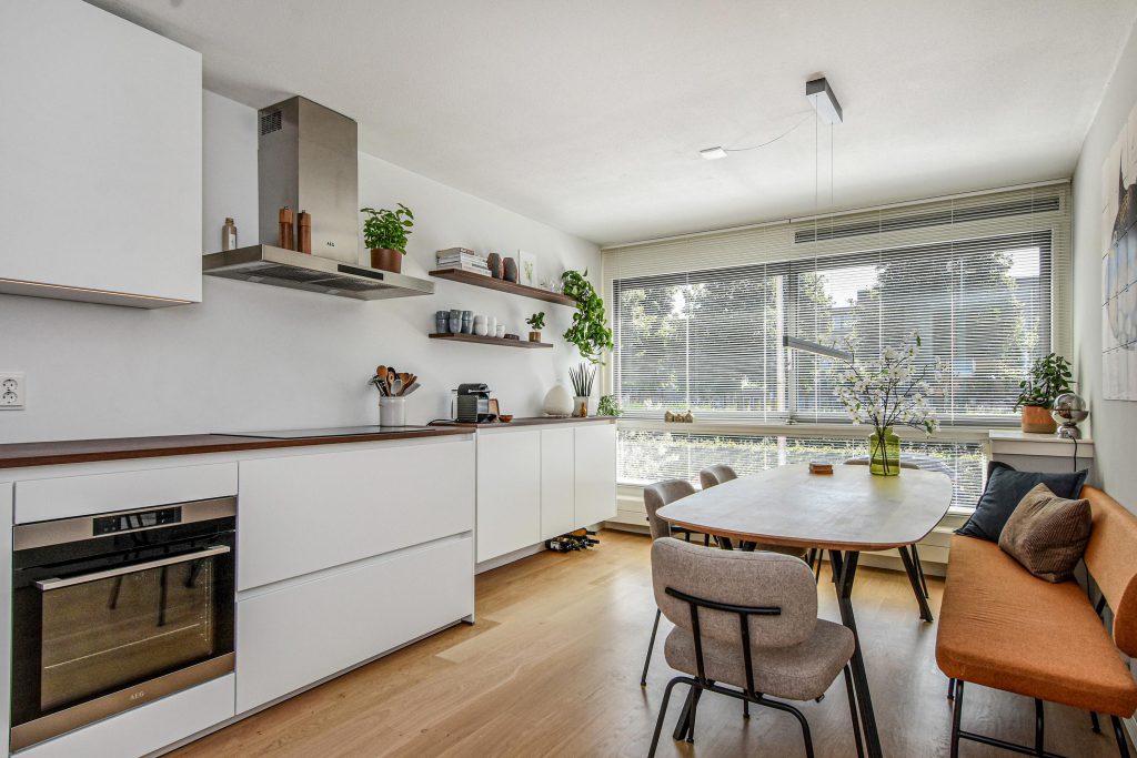 De moderne keuken aan de voorzijde is uitgevoerd in strak wit met en v.v. hoogwaardige apparatuur o.a. inductie kookplaat, afzuigkap met plasma filter, oven, koelkast. Een ideale plek om te koken, te borrelen of te ontbijten met uitzicht op de rustige straat en het groen.