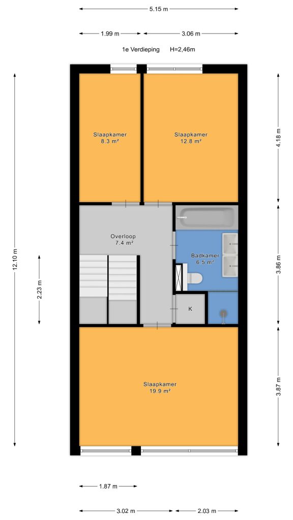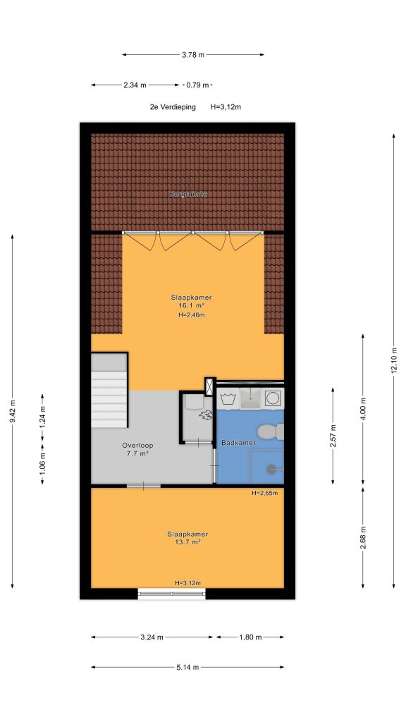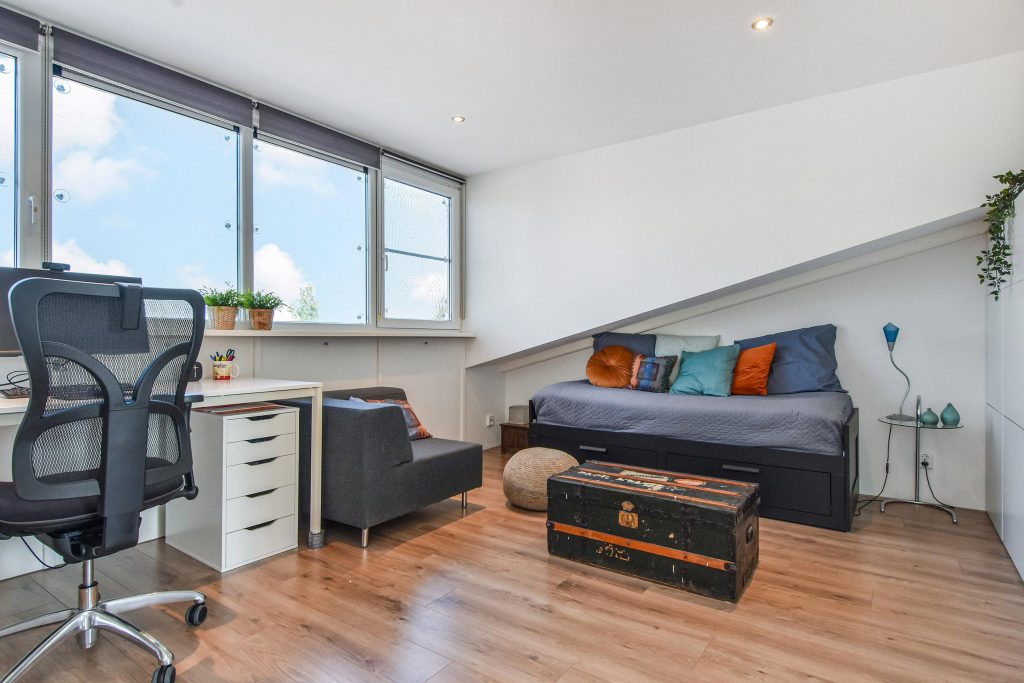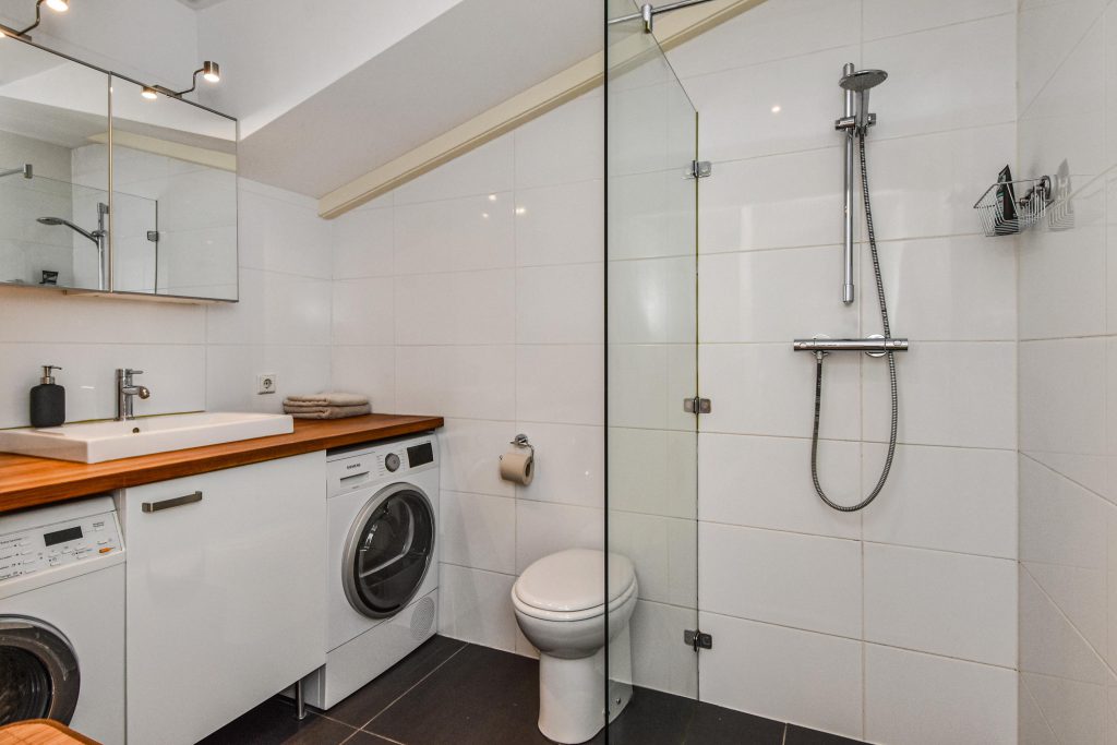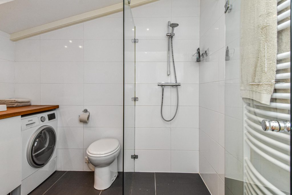 Op de tweede verdieping bevinden zich nog twee ruime slaapkamers en een tweede badkamer, ideaal voor gasten, een kantoor aan huis of oudere kinderen die graag hun eigen verdieping hebben. Dankzij de hoogte, de grote dakkapel, het licht en de rustige afwerking zijn ook deze kamers heerlijk om in te verblijven. De badkamer beschikt over een douche, toilet, wastafel en de laundry-gedeelte met wasmachine- en drogeraansluiting. Daarnaast is er ook veel extra inpandige bergruimte in de achterslaapkamer.