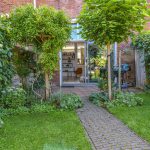 De ruimte ademt rust uit en is v.v. van de lichte houten massieve eiken vloer en moderne haard die zowel sfeer als warmte brengt. De grote glazen pui opent naar de zonnige, fraai aangelegde tuin, een privé-oase met groen, terras en volop zonlicht en achterom.